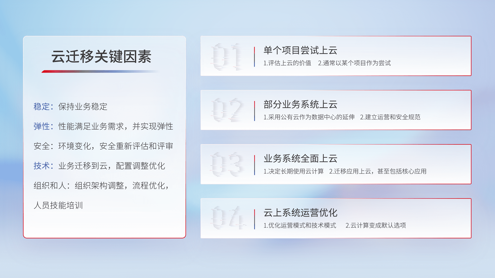 结合实际业务,,,,从规划设计、、、云平台选型、、云原生改造、、数据迁移、、集成交付,,迁移全过程为客户识别最佳上云路径,,,,做好风险识别管理,,,,设计网络架构、、身份权限、、、、安全审计合规、、操作审计、、、、日志审计、、、、监控告警策略、、、、多站点容灾设计等,,,,对云上基础设施进行整体规划,,提升IT治理水平,,,,以满足弹性、、、、高可用、、、、高性能的需求。。
