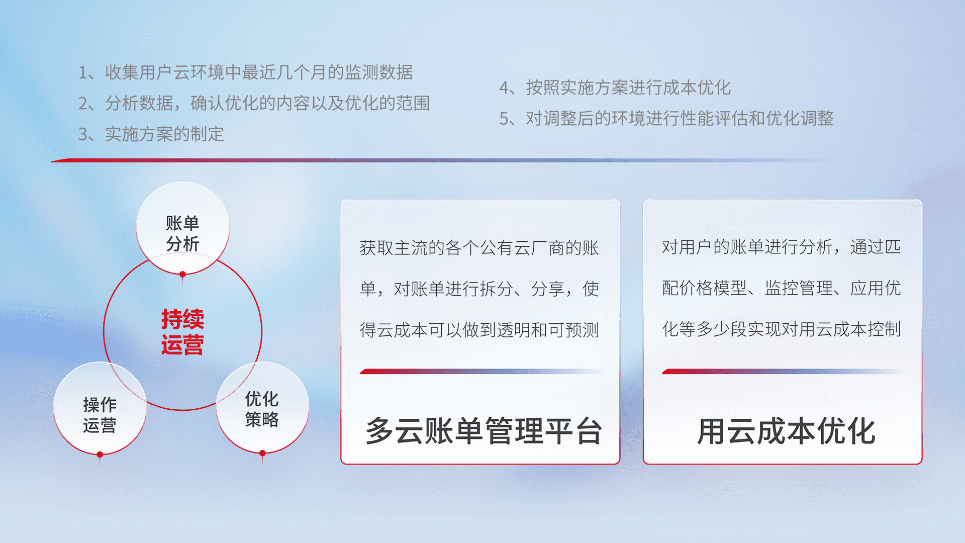 通过多云纳管,,,,以统一的资源数据模型把客户的云资源进行抽象和封装,,,进而实现对多云资源的统一操作,,,保障云资源管理的可靠性、、、稳定性与可用性。。。。量身定制化运维内容,,配置、、、、开发运维、、补丁管理、、、备份、、、、监控、、、认证和访问管理、、、、审计和日常巡检等,,,保障在用云过程中的可靠度,,,,稳定度以及高可用率。。。。